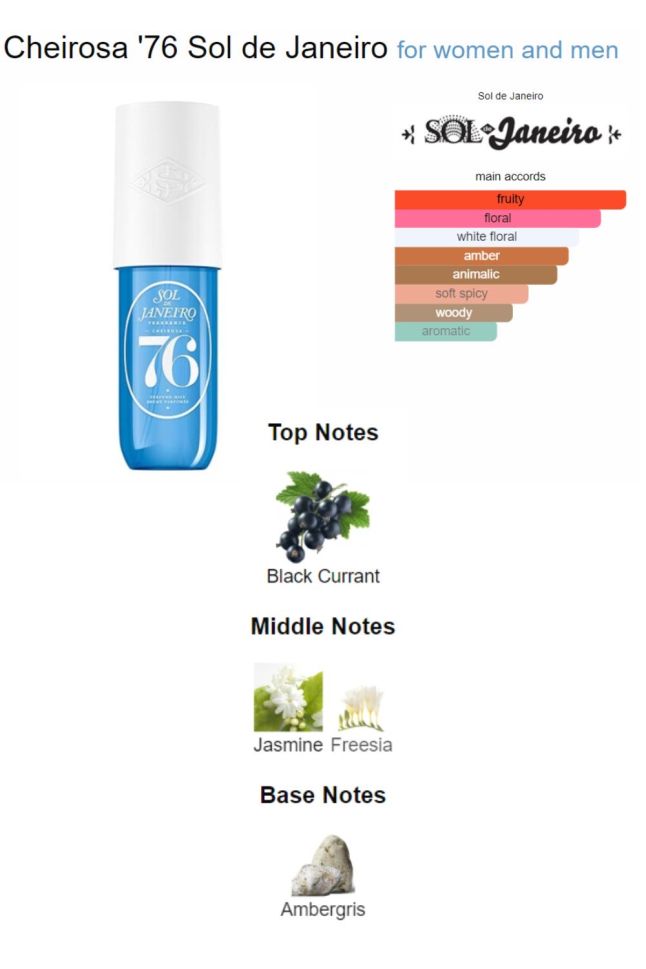 Sol de Janeiro Cheirosa 76 е сладък, топъл и чувствен аромат за тяло и коса с нотки на круша, касис, ванилия, жасмин и карамелен амбър.