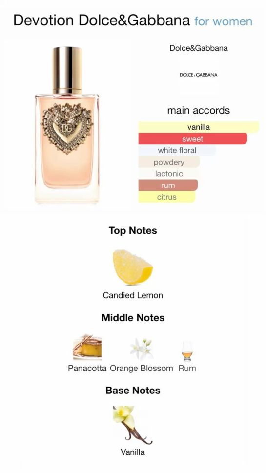 Луксозен женски аромат, вдъхновен от топлината и радостта на италианския стил, който съчетава сладка, гурме свежест и кремообразни, съблазнителни нотки. Отваря се с искрящо захаросан лимон и портокалов цвят, които плавно преминават в сърце от панакота и ром, за да се установят върху богата ванилия в основата.